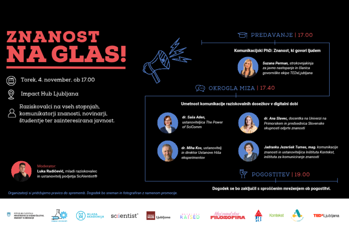 Dogodek Znanost na glas!Vabljeni na dogodek Znanost na glas!, ki bo potekal v torek, 4. novembra 2025, ob 17. uri v prostorih Impact Hub Ljubljana. Dogodek odpira vprašanje, kako raziskovalci in strokovnjaki širši javnosti približajo znanstvena spoznanja v času družbenih omrežij, kratkih formatov in generativne umetne inteligence. Razprava se bo vrtela okrog pomena znanstvene komunikacije, prilagajanja kompleksnih tem različnim občinstvom ter odgovorne rabe novih orodij. Namen dogodka je okrepiti dialog med znanostjo in družbo ter ponuditi konkretne prakse in nasvete za učinkovitejši javni nastop raziskovalcev.ProgramDogodek se bo začel s predavanjem Suzane Perman, strokovnjakinje za javno nastopanje in članice govorniške ekipe TEDxLjubljana, z naslovom »Komunikacijski PhD«.Predavanju sledi okrogla miza z naslovom »Umetnost komuniciranja raziskovalnih dosežkov v digitalni dobi« in naslednjimi gosti: dr. Saša Aden, ustanoviteljica The Power of SciComm, dr. Miha Kos, ustanovitelj in direktor Ustanove Hiša eksperimentov, dr. Ana Slavec, docentka na Univerzi na Primorskem in predsednica Slovenske skupnosti odprte znanosti, Jadranka Jezeršek Turnes, mag. komunikacije znanosti in ustanoviteljica Inštituta Kontekst, inštituta za komuniciranje znanosti.Program se bo zaključil s sproščenim mreženjem s pogostitvijo.Dogodek je brezplačen, a zahteva predhodno . Dogajanje se bo snemalo in fotografiralo za namene promocije. Dogodek poteka v sklopu , ki ga v jesenskih mesecih pripravlja Ministrstvo za visoko šolstvo, znanost in inovacije (MVZI). Gre za slovensko pobudo za promocijo, popularizacijo in komuniciranje znanosti. Mesec znanosti je “mesec”, ki traja kar tri mesece – letos se bo med 16. septembrom in 17. decembrom zvrstilo več kot 70 dogodkov, ki bodo na inovativen in interaktiven način približali znanstvene dosežke širši javnosti.
