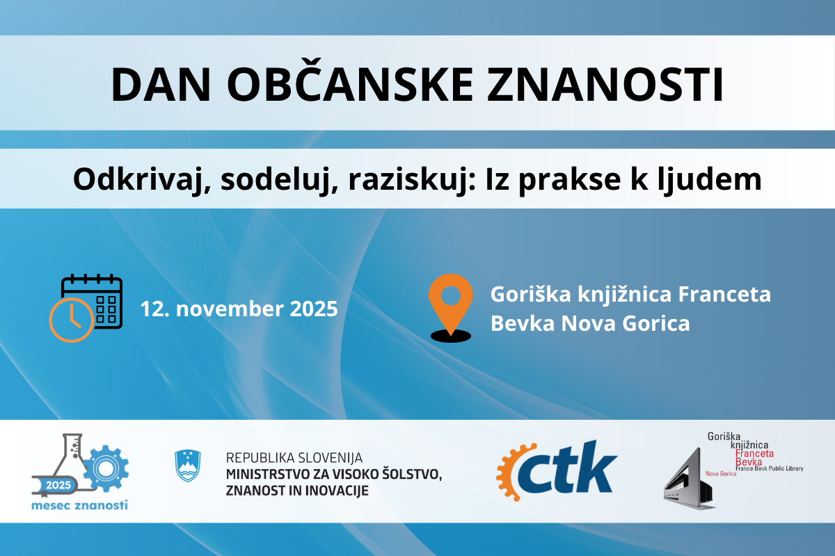 V okviru Meseca znanosti bo 12. novembra 2025 v Goriški knjižnici Franceta Bevka potekal nacionalni dogodek Dan občanske znanosti, ki ga organizira CTK.