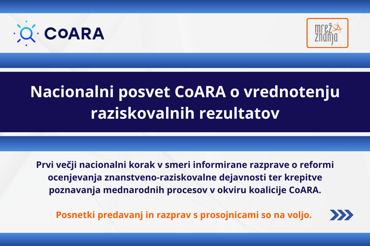 Nacionalni posvet CoARA o vrednotenju raziskovalnih rezultatov je 18. novembra 2025 v Ljubljani v okviru konference izvedla dvodelni posvet z naslovom Vrednotenje raziskovalnih rezultatov. Posvet je bil namenjen razpravi o reformi ocenjevanja znanstveno-raziskovalne dejavnosti in vlogi bibliometričnih kazalnikov v novem sistemu vrednotenja v okviru stabilnega financiranja.V prvem delu posveta so domači in tuji strokovnjaki predstavili teoretične in praktične pristope k uravnoteženju kvalitativnega strokovnega pregleda in kvantitativnih kazalnikov. Sodelovali so prof. dr. Primož Južnič (NAKVIS), Rita Morais (EUA), Herman Strøm (Univerza jugovzhodne Norveške) in prof. dr. Gregor Majdič (UL).Drugi del je bil posvečen razpravi o slovenskem kontekstu in izzivih uvajanja reforme ocenjevanja znanstveno-raziskovalne dejavnosti, pri čemer je panel poudaril pomen odgovorne rabe bibliometrije kot dopolnila kvalitativnemu vrednotenju. Razpravo je moderiral dr. Klemen Miklavič (ARIS), sodelovali pa so dr. Špela Stres (EIC), Neja Bizjak Štrus (Mlada akademija), prof. dr. Mitja Žagar (Institut za narodnostna vprašanja), doc. dr. Anže Županič (NIB), prof. dr. Gregor Majdič (UL) in dr. Franci Demšar (NAKVIS).Dogodek je predstavljal prvi večji nacionalni korak v smeri informirane razprave o reformi ocenjevanja znanstveno-raziskovalne dejavnosti ter krepitve poznavanja mednarodnih procesov v okviru koalicije .Posnetki predavanj in razprav s prosojnicami so na voljo . Srečanje je organizirala s podporo (CTK, UM UKM).