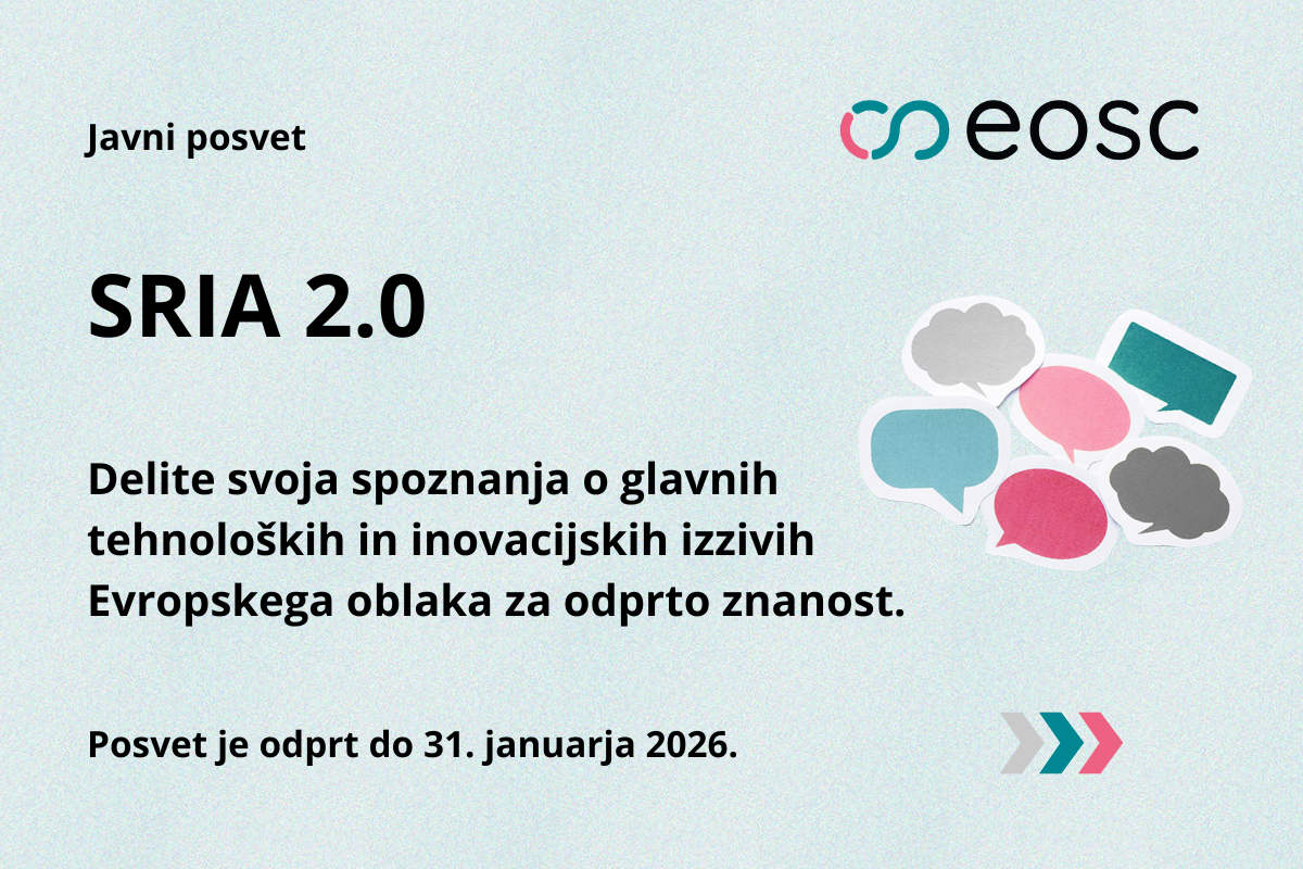 Javni posvet: Strategija za razvoj Evropskega oblaka odprte znanosti (SRIA 2.0)Združenje EOSC Association je odprlo javno konzultacijo za posodobljeno strateško agendo , ključno usmeritev za razvoj Evropskega oblaka odprte znanosti (EOSC) po letu 2027. Konzultacija omogoča raziskovalcem, organizacijam, ponudnikom storitev in drugim deležnikom, da neposredno prispevajo svoja mnenja in predloge pri oblikovanju prihodnjih strateških prioritet in tehnoloških izzivov EOSC.Kaj sta EOSC in SRIA? (EOSC) je evropska iniciativa, katere cilj je vzpostaviti federirano, odprto in zaupanja vredno digitalno okolje za raziskave, kjer lahko znanstveniki in inovatorji najdejo, uporabljajo in ponovno uporabijo podatke, orodja in storitve iz različnih disciplin in držav. EOSC temelji na načelih FAIR — podatki morajo biti najdljivi, dostopni, interoperabilni in ponovno uporabni. pa je strateški dokument, ki določa splošni okvir za prihodnje raziskave, razvoj in inovacije v povezavi z EOSC. Vključuje tudi večletni načrt Multi-Annual Roadmap (MAR), ki služi usmerjanju programov dela Evropske unije, kot je Horizon Europe.Zakaj je odprta konzultacija pomembna?Različica SRIA 2.0 bo osnova za razvoj EOSC po letu 2027 v prihodnji fazi delovanja in implementacije pod novim modelom upravljanja. Odprta javna konzultacija je ključna priložnost za: izmenjavo mnenj o strateških izzivih in priložnostih v EOSC, soustvarjanje vizije in prioritet za obdobje 2026–2030, vpliv na oblikovanje tehnoloških, inovacijskih in političnih usmeritev v evropskem prostoru odprte znanosti.Kako sodelovatiJavni posvet traja do 31. januarja 2026 in je odprta za vse zainteresirane posameznike ter organizacije. Svoje predloge, ki bodo neposredno vplivali na vsebino SRIA 2.0, lahko podajo preko .