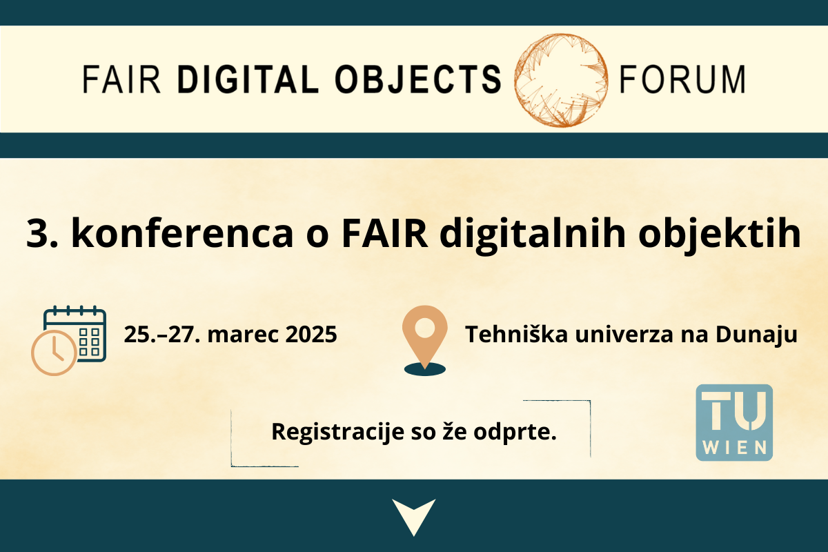 Odprte so registracije za 3. konferenco o FAIR digitalnih objektih (FDO 2026)Že 3. konferenca o FAIR digitalnih objektih (FDO 2026) bo potekala med 25. in 27. marcem 2026 na Tehniški univerzi na Dunaju (TU Wien). Organizatorji so že objavili program konference, ki ponuja celovit pregled vsebin in tematskih sklopov letošnjega dogodka.Letošnja konferenca z naslovom »TRUST and FDO« bo v ospredje postavila vprašanje zaupanja kot ključnega elementa učinkovite izmenjave podatkov in delujočih podatkovnih trgov. Razprave bodo namenjene temam podatkovne suverenosti, preglednosti, odgovornosti in trajnosti ter vlogi FAIR digitalnih objektov (FDO) pri vzpostavljanju zanesljivih podatkovnih ekosistemov in podpori razvoju umetne inteligence.Odprte so tudi že registracije za udeležbo na konferenci, zainteresirani pa lahko na spletni strani dogodka poleg prijavnih informacij najdejo tudi podrobnosti o posameznih vsebinskih sklopih, predavateljih in spremljevalnih dejavnostih, ki bodo zaznamovale letošnje srečanje.Konferenca je namenjena širokemu krogu deležnikov, od oblikovalcev podatkovnih politik in raziskovalcev do razvijalcev in drugih strokovnjakov, ki delujejo na področju podatkovnih tehnologij in standardizacije. Dogodek bo priložnost za izmenjavo izkušenj, razpravo o aktualnih izzivih in krepitev zaupanja v podatkovno podprte raziskovalne in inovacijske procese.REGISTRACIJA IN PROGRAM