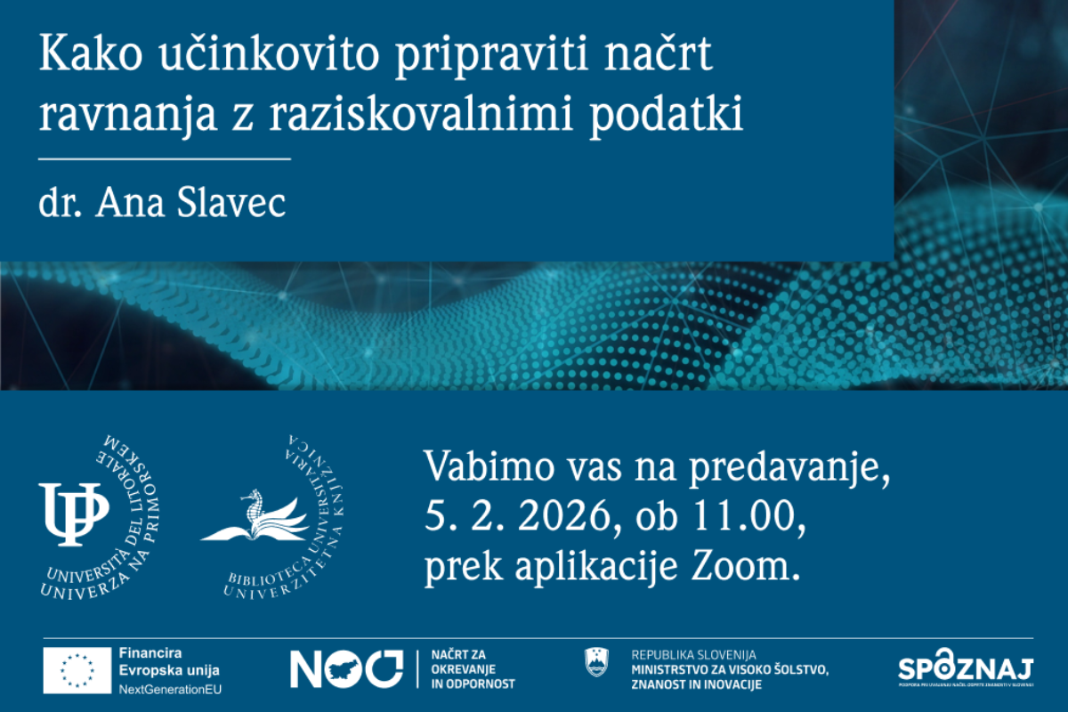 Predavanje SPOZNAJ: Kako učinkovito pripraviti načrt ravnanja z raziskovalnimi podatkiV četrtek, 5. februarja 2026, vas Univerza na Primorskem ob 11.00 vabi na spletno predavanje Kako učinkovito pripraviti načrt ravnanja z raziskovalnimi podatki. Predavala bo dr. Ana Slavec (UP FAMNIT in UP IAM). Dogodek bo potekal v slovenskem jeziku prek aplikacije Zoom (, Meeting ID: 620 4429 5454).Na predavanju bosta predstavljena pomen in praktični vidik priprave načrtov ravnanja z raziskovalnimi podatki (NRRP), ki jih danes zahteva vse več raziskovalnih financerjev, med drugim tudi Javna agencija za znanstvenoraziskovalno in inovacijsko dejavnost Republike Slovenije. NRRP je ključni del raziskovalnega procesa, saj zagotavlja pregled nad postopki ravnanja s podatki, njihovo dolgoročno hrambo ter čim širšo dostopnost v skladu z načeli FAIR.Najprej bo predstavljeno ozadje, zakaj financerji raziskovalne dejavnosti vse bolj strogo zahtevajo izdelavo NRRP-jev, katere informacije morajo raziskovalci vanje vključiti ter kako se načrt razvija skozi celoten življenjski cikel raziskave. Osrednji del bo namenjen praktični predstavitvi priprave načrta na podlagi konkretnih primerov. Predstavljeno bo, kako v praksi reševati vprašanja glede ravnanja z občutljivimi podatki, izbire ustreznih repozitorijev, dokumentiranja, organizacije podatkov in določanja ravni dostopa. Poudarjeni bodo tudi najpogostejši izzive, s katerimi se raziskovalci srečujejo pri izpolnjevanju teh zahtev. V zaključnem delu bodo predstavljeni različni obrazci in predloge, ki jih uporabljajo financerji. Predavanje bo tako povezalo teoretične zahteve financerjev s praktičnimi primeri, ki bodo raziskovalcem v pomoč pri učinkovitem načrtovanju in deljenju raziskovalnih podatkov.Dr. Ana Slavec je zaposlena na Univerzi na Primorskem, delno kot docentka na Fakulteti za matematiko, naravoslovje in informacijske tehnologije ter delno kot znanstvena sodelavka na Inštitutu Andrej Marušič, raziskovalna skupina InnoRenew CoE. Na Univerzi na Primorskem poučuje statistiko ter sodeluje pri implementaciji nacionalnega akcijskega načrta za odprto znanost ter v delovni skupini za odprto znanost zveze univerz T4EU in je usposobljena za podatkovno svetovalko. Raziskovalno se osredotoča na uporabo anketnih metod na področju trajnostne gradnje in vodi projekt Socialno-psihološki vidiki dolgoročnega odločanja zasebnih lastnikov gozdov in domov (SLOTH). Je predsednica Slovenske skupnosti odprte znanosti (SSOZ) in članica delovne skupine za odprto znanost pri Javni agenciji za raziskovalno in inovacijsko dejavnost RS.Na dogodek se lahko prijavite .Gre za dvanajsto predavanje v seriji OZUP – Odprta Znanost na Univerzi na Primorskem. Dogodek organizira Univerza na Primorskem v okviru projekta SPOZNAJ (Podpora pri uvajanju načel odprte znanosti v Sloveniji). V primeru morebitnih vprašanj se lahko obrnete na dr. Ano Slavec, ki je urednica predavanj v seriji OZUP.Projekt SPOZNAJ sofinancirata Evropska unija - NextGenerationEU in Ministrstvo za visoko šolstvo, znanost in inovacije prek nacionalnega Načrta za okrevanje in odpornost.