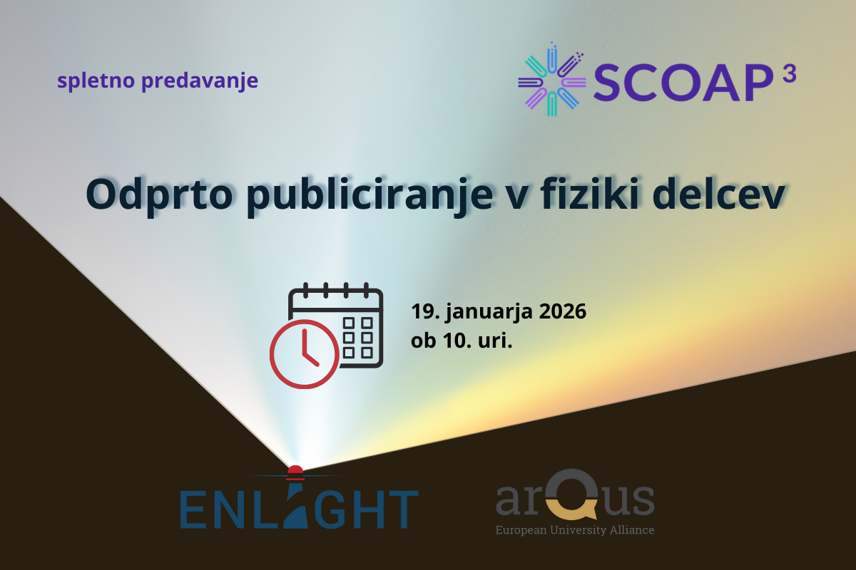 Spletni seminar SCOAP3: odprto publiciranje v fiziki delcevLepo vabljeni na 11. spletni seminar Ambasadorjev odprte znanosti zavezništev in , ki bo v ponedeljek, 19. januarja 2026, ob 10. uri. Seminar bo potekal v spletnem okolju, povezava do dogodka pa bo prijavljenim udeležencem posredovana naknadno. Tokrat bo posvečen temi SCOAP3 – sponzorski konzorcij za odprto publiciranje v fiziki delcev (SCOAP3: Sponsoring Consortium for Open Access Publishing in Particle Physics).Predavatelj bo prof. dr. Stefan Hohenegger z Univerze Claude Bernard Lyon 1, ki bo predstavil delovanje in razvoj konzorcija SCOAP3 ter nekatere inovativne prakse, s katerimi ta prispeva k razumevanju znanstvene komunikacije kot globalnega javnega dobra. je edinstveno mednarodno partnerstvo, ki združuje več kot tri tisoč knjižnic, financerjev in raziskovalnih ustanov iz 47 držav, regij ali ozemelj ter tri medvladne organizacije. Spletni seminar predstavlja odlično priložnost za izmenjavo idej in izkušenj na področju odprte znanosti, tako znotraj partnerske mreže kot širše raziskovalne skupnosti.Več informacij o spletnem seminarju najdete , prijavite pa se lahko .Vas zanimajo tudi pretekli spletni seminarji?Vsi spletni seminarji ENLIGHT na temo odprte znanosti so posneti. Posnetki, predstavitve in spremljevalna gradiva so na voljo na naslednjih platformah: (posnetki vseh spletnih seminarjev o odprti znanosti), (objavljene predstavitve spletnih seminarjev), (arhiv predstavitev in gradiv vseh spletnih seminarjev), .