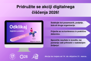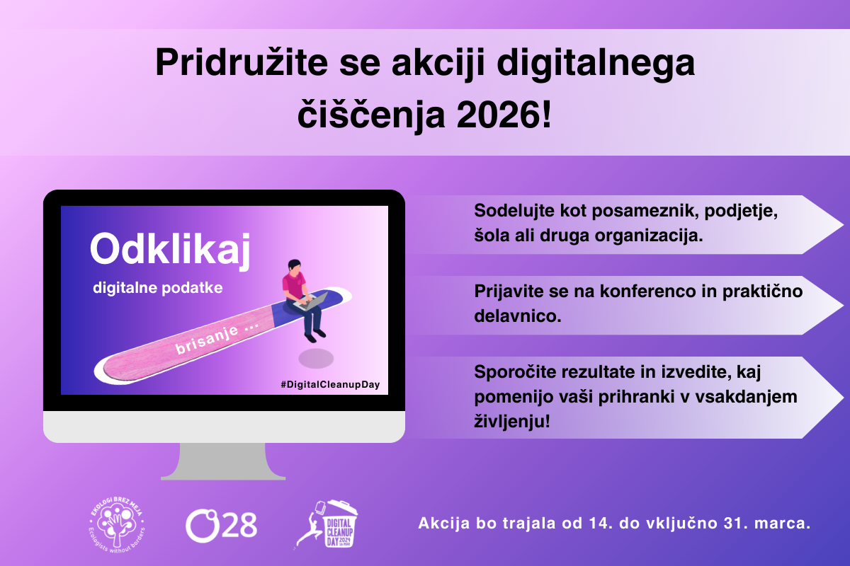 Očistimo Slovenijo digitalnih odpadkov 2026Letošnja akcija Očistimo Slovenijo digitalnih odpadkov 2026 () se bo začela 14. marca 2026 in bo potekala do 31. marca 2026. Posamezniki, organizacije in skupnosti lahko digitalno čiščenje izvedejo kadarkoli v tem obdobju ter svoje rezultate sporočijo organizatorjem, ki jih bodo prišteli k skupnemu nacionalnemu rezultatu.Akcija spodbuja odstranjevanje odvečnih digitalnih podatkov in trajnostno upravljanje digitalnih vsebin. Z zmanjševanjem količine nepotrebno shranjenih podatkov je mogoče prispevati k manjšim emisijam CO₂, daljši življenjski dobi elektronske opreme ter manjšemu digitalnemu okoljskemu odtisu. Pobuda hkrati krepi ozaveščenost o vplivu digitalnih praks na okolje in spodbuja razvoj dolgoročno vzdržnih digitalnih navad.Pobuda je tesno povezana tudi z načeli odprte znanosti, ki poudarjajo odgovorno ravnanje z raziskovalnimi podatki skozi celoten njihov življenjski cikel – od zbiranja in shranjevanja do dolgoročne hrambe ali izbrisa. Učinkovito upravljanje podatkov, redno pregledovanje in odstranjevanje nepotrebnih vsebin ter premišljena raba digitalne infrastrukture prispevajo k trajnostni in pregledni raziskovalni praksi.V okviru akcije bo v sredo, 11. februarja 2026, med 10.00 in 14.30 potekala . Tej bo sledila tudi delavnica, primerna za širšo javnost. Poudarek bo na povezavi med digitalnimi praksami, strojno opremo in njihovimi posledicami, od e-odpadkov do uporabniške izkušnje in tehnološke odvisnosti. Po konferenčnem delu bo organiziran tudi praktični digitalni čistilni servis z ambasadorji Evropskega podnebnega pakta. Za udeležbo je potrebna predhodna prijava.Cilji akcije so: odstraniti čim več odvečnih podatkov do 31. marca 2026, povečati nacionalno ozaveščenost o digitalnih odpadkih, spodbuditi trajne dobre digitalne navade ter navdihniti posameznike in organizacije k odgovornemu ravnanju tudi v digitalnem okolju. Udeleženci bodo po oddaji rezultatov prejeli tudi oceno okoljskega prihranka v primerljivih kazalnikih (npr. ekvivalent prevoženih kilometrov).V akcijo se lahko vključijo posamezniki, družine, šole, podjetja in druge organizacije. Več informacij ter navodila za sodelovanje so na voljo na .