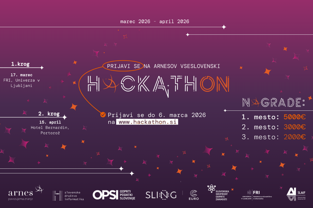 Arnesov HackathON 2026 v sodelovanju s , , , in organizira že tretji vseslovenski HackathON, letos s poudarkom na umetni inteligenci.Po izjemnem odzivu v preteklih letih – lani se je tekmovanja udeležilo več kot 90 tekmovalk in tekmovalcev v 28 ekipah – se HackathON vrača z izzivi, osredotočenimi na uporabo umetne inteligence na štirih tematskih področjih: znanost, zdravje in biotehnologija, digitalna družba ter zeleni prehod. Poleg tekmovalnega dela bodo organizirana tudi izobraževanja s področij superračunalništva, umetne inteligence in etike uporabe naprednih tehnologij.Prvi krog tekmovanja bo potekal 17. marca 2026 na Fakulteti za računalništvo in informatiko Univerze v Ljubljani, drugi krog pa 15. aprila 2026 v okviru Konference Slovenskega društva Informatika v Portorožu. HackathON ni zasnovan kot 24-urni dogodek, saj ekipam omogoča razvoj rešitev tudi v času med obema krogoma, s čimer spodbuja poglobljeno delo in kakovostnejše rezultate. Za najinovativnejše rešitve je v nagradnem skladu namenjenih 10.000 evrov.Prijave so odprte do 6. marca 2026. Več informacij in prijava sta na voljo na .Arnesov HackathON 2026 poteka pod častnim pokroviteljstvom predsednice Republike Slovenije dr. Nataše Pirc Musar in Slovenske komisije za UNESCO.