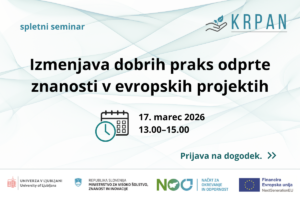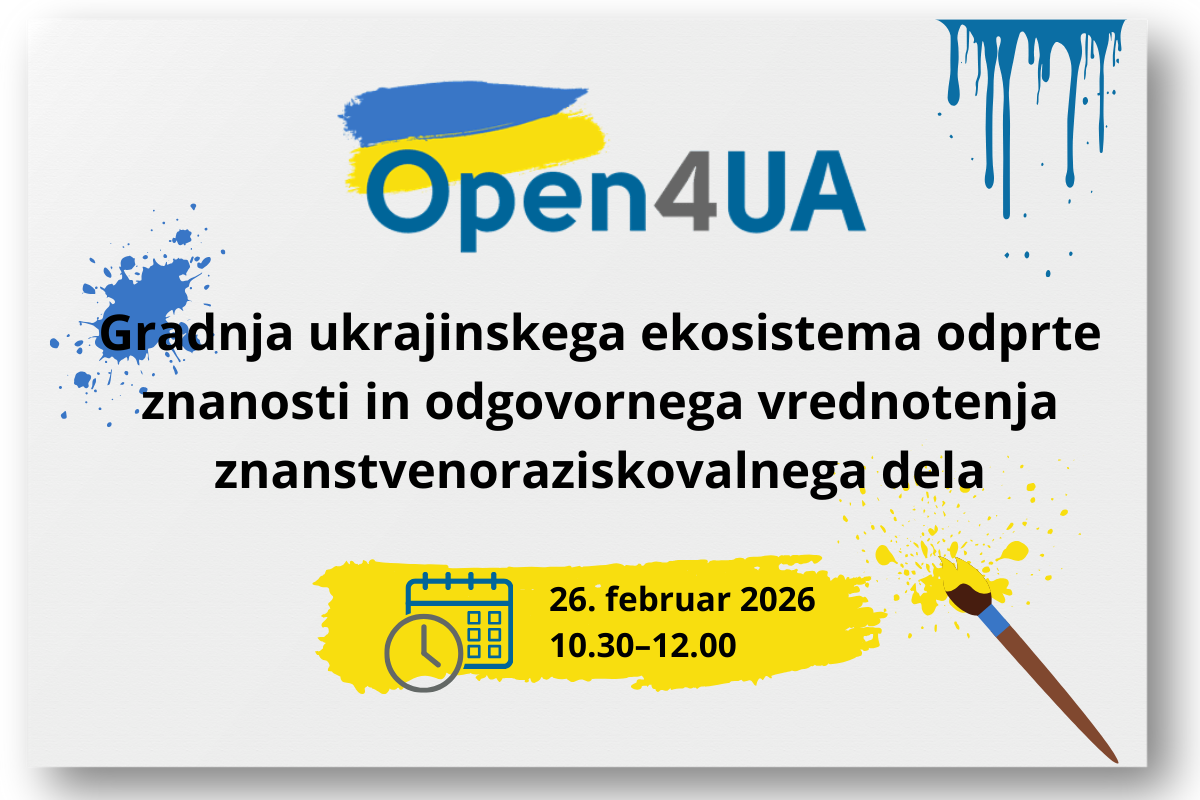 Open4UA: gradnja ukrajinskega ekosistema odprte znanosti in odgovornega vrednotenja znanstvenoraziskovalnega delaV sredo, 26. februarja 2026, ob 10.30 bo potekala predstavitev projekta , ki naslavlja vlogo odprte znanosti in odgovornega vrednotenja znanstvenoraziskovalnega dela pri povojnem okrevanju Ukrajine. Projekt Open4UA (Erasmus+ CBHE) je usmerjen v sistemske reforme, ki krepijo preglednost, integriteto in mednarodno zaupanje ter prispevajo k postopnemu vključevanju Ukrajine v Evropski raziskovalni prostor.Med ključnimi dosežki projekta so priprava osnutka zakona za utrditev nacionalne politike odprte znanosti, razvoj institucionalnega nabora orodij ter oblikovanje na dokazih temelječih priporočil, ki izhajajo iz najboljših praks Evropske unije. Projekt posebno pozornost namenja usklajevanju državnih certifikacijskih postopkov in projektne evalvacije z načeli in , s čimer v obdobju 2025–2026 preoblikuje obstoječe vrednotenje znanstvenoraziskovalnega dela za več kot 500 institucij.Predstavitev bosta izvedla dr. Oleksandr Berezko, izredni profesor na Nacionalni politehnični univerzi v Lvovu in vodja projekta Open4UA, ter projektni sodelavec oziroma sodelavka z Univerze v Ljubljani, ki bo predstavila vlogo in prispevek partnerske institucije.Na dogodek se lahko prijavite .Predstavitev bo potekala v angleščini. Po dogodku bodo zagotovljeni slovenski in angleški podnapisi, skupaj s posnetkom predstavitve, ki bo dostopen za kasnejši ogled na platformi .