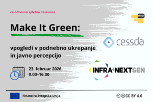 Make It Green: vpogledi v podnebno ukrepanje in javno percepcijoV ponedeljek, 23. februarja 2026, bo med 9. in 16. uro potekala celodnevna spletna delavnica Make It Green: vpogledi v podnebno ukrepanje in javno percepcijo, ki se osredotoča na vlogo družboslovnih raziskav pri podpori podnebnemu ukrepanju in zelenim projektom v Evropi. Delavnica poteka v okviru dejavnosti projekta in konzorcija .Delavnica udeležence uvaja v zeleni steber programa NextGenerationEU ter prikazuje, kako lahko družboslovne raziskave prispevajo k razumevanju podnebnih izzivov, oblikovanju učinkovitih politik in podpori zelenemu prehodu. Program združuje strokovne predstavitve in praktično skupinsko delo, pri čemer udeleženci spoznajo ključne teoretske okvire, relevantne evropske podatkovne vire ter pristope k aplikativnemu raziskovanju.Akademski strokovnjaki bodo predstavili temeljne koncepte in modele, povezane z zelenim stebrom, ter pregled pomembnih evropskih raziskav in podatkovnih virov, kot so European Social Survey (ESS), European Values Study (EVS), Generations and Gender Programme (GGP) in nabor podatkov CRONOS-3. Strokovnjaki Skupnega raziskovalnega središča (JRC) bodo osvetlili, kako družboslovne raziskave prispevajo k oblikovanju na dokazih temelječih zelenih politik.V praktičnem delu delavnice bodo udeleženci v manjših skupinah razvijali raziskovalna vprašanja, relevantna za javne politike, izbirali ustrezne podatkovne vire in načrtovali izvedljive analitične pristope. Vodeno skupinsko delo bo omogočilo pripravo prvih analiz ter kratkih predstavitev ali vizualnih povzetkov, delavnica pa se bo zaključila s predstavitvami skupin in razpravo o zasnovi raziskav, ugotovitvah in nadaljnjih korakih.Ob zaključku delavnice bodo udeleženci bolje usposobljeni za uporabo teoretskih okvirov in evropskih družboslovnih podatkov pri raziskovanju podnebnih vprašanj, za razvoj izvedljivih in politično relevantnih raziskovalnih vprašanj ter za učinkovito komuniciranje raziskovalnih izsledkov akademskemu in političnemu občinstvu.Za udeležbo na delavnici je potrebna predhodna prijava .Član SSOZ, , ki je nacionalna raziskovalna podatkovna infrastruktura za družboslovje, je del konzorcija CESSDA ERIC, zato je slovenski raziskovalni prostor posredno vključen v širši evropski okvir dejavnosti in usposabljanj, povezanih s projektom Infra4NextGen.