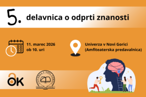 5. delavnica o odprti znanosti na Univerzi v Novi GoriciUniverzitetna knjižnica Univerze v Novi Gorici vabi na 5. delavnico o odprti znanosti, ki bo potekala v sredo, 11. marca 2026, med 10.00 in 13.30 na Univerzi v Novi Gorici v Ajdovščini (Amfiteaterska predavalnica). Dogodek bo potekal v angleškem jeziku, registriranim udeležencem pa bo omogočena tudi udeležba prek platforme Zoom.Delavnica bo predstavila Slovensko skupnost odprte znanosti in njeno vlogo pri izvajanju Nacionalnega akcijskega načrta za odprto znanost. Poseben poudarek bo namenjen tudi vlogi založbe MDPI v odprti znanosti ter različnim modelom znanstvenega objavljanja. Obravnavani bodo etični temelji znanstvenega založništva, mednarodni standardi, vključno s smernicami COPE (Committee on Publication Ethics), ter priložnosti in tveganja uporabe umetne inteligence v raziskovalnem in založniškem okolju.Teme bodo predstavili dr. Ana Slavec, predsednica Slovenske skupnosti odprte znanosti z Univerze na Primorskem, ter strokovnjaki založbe MDPI. in Dogodek je del aktivnosti v okviru Akcijskega načrta za odprto znanost, ki ga financira Vlada Republike Slovenije.