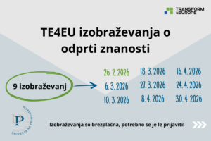 T4EU izobraževanja o odprti znanosti in pobuda vabita raziskovalce in druge zainteresirane na T4EU izobraževanja o odprti znanosti (T4EU Open Science). Le ta ponujajo celovit učni program za razvoj praktičnih znanj s področja odprte znanosti. S pričetkom februarja 2026, bo organiziranih več brezplačnih spletnih izobraževanj, namenjenih krepitvi kompetenc na področju odprtih raziskovalnih praks, upravljanja podatkov in razumevanja političnih ter strateških okvirov odprte znanosti.Program je zasnovan kot strukturirana učna pot, ki udeležencem omogoča poglobitev razumevanja načel odprte znanosti ter njihove praktične uporabe v raziskovalnem delu. Poseben poudarek je namenjen preglednosti, sodelovanju in dostopnosti raziskovalnih rezultatov, pa tudi odgovornemu ravnanju z raziskovalnimi podatki in usklajevanju z relevantnimi politikami ter priporočili.Udeležba na izobraževanjih je brezplačna, obvezna pa je predhodna prijava prek .Urnik izobraževanj.t4eu-table { width: 100%; border-collapse: collapse; margin: 20px 0; font-size: 15px;}.t4eu-table th,.t4eu-table td { border: 1px solid #ddd; padding: 10px; text-align: left;}.t4eu-table th { background-color: #f4f4f4; font-weight: 600;}@media screen and (max-width: 768px) { .t4eu-table thead { display: none; } .t4eu-table, .t4eu-table tbody, .t4eu-table tr, .t4eu-table td { display: block; width: 100%; } .t4eu-table tr { margin-bottom: 15px; border: 1px solid #ddd; padding: 10px; } .t4eu-table td { border: none; padding: 5px 0; } .t4eu-table td::before { content: attr(data-label); font-weight: bold; display: block; margin-bottom: 3px; }}DatumČasIzobraževanjePredavatelj26. 2. 202610.00–12.00Open Science: Principles, Practices, and Pathways to TransparencyMario Guillo (University of Alicante)6. 3. 202610.00–11.30Data Management Planning in line with FAIR principlesAna Slavec (University of Primorska)10. 3. 202610.00–11.30Open Science for Survey DataAna Slavec (University of Primorska)18. 3. 202610.00–11.30Open Science in the Health ResearchMaria Perdigão in Patrícia Carvalho (Universidade Católica Portuguesa)27. 3. 202611.00–12.00Open Source and Free SoftwareDaniele Albrizio (University of Trieste)8. 4. 202612.00–13.00Citizen ScienceStefano Martellos (University of Trieste)16. 4. 202611.00–12.00Open Science and Data RepositoriesJordan Piščan in Davide Franch (University of Trieste)24. 4. 20269.00–10.00Introduction to PreregistrationsKarolin Gieseler (Saarland University)30. 4. 202612.00–13.00Open Science in BiodiversityStefano Martellos (University of Trieste)Več informacij o posameznih izobraževanjih in vsebinah je na voljo .