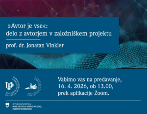 V četrtek, 16. aprila 2026, ob 13.00 vabljeni na spletno predavanje »Avtor je vse«: delo z avtorjem v založniškem projektu. Predaval bo prof. dr. Jonatan Vinkler.