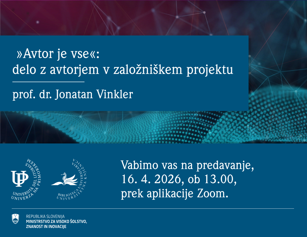Predavanje »Avtor je vse«: delo z avtorjem v založniškem projektuV četrtek, 16. aprila 2026, ob 13.00 vabljeni na spletno predavanje »Avtor je vse«: delo z avtorjem v založniškem projektu. Predaval bo prof. dr. Jonatan Vinkler (UP FHŠ in UP UK). Dogodek bo potekal v slovenskem jeziku prek aplikacije (Meeting ID: 651 4457 2427).Založniški projekt je a) zaporedje interakcij med delovalniki in njihovimi vložki/vplivi, ki mora b) v dogovorjenem roku c) rezultirati v uspešni izdaji (tj. taki, ki najde recipiente; ti delo prevzamejo v obliki odprte objave ali izdajo kupijo). Ključna akterja sta avtor in založba, zato predavanje obravnava ključno vlogo uredniškega in založniškega dela z avtorjem v sodobnem akademskem založništvu.Osrednji namen je predstaviti sistematičen, strokovno vodljiv proces, ki zagotavlja visoko kakovost publikacije, hkrati pa ohranja avtorjevo avtonomijo in motivacijo. Komunikacija je opredeljena kot »celovita, transparentna in demokratična«: nekonfliktna, a odločno vodena, saj avtor praviloma ni seznanjen z založniškimi postopki, roki, tehničnimi zahtevami in tržnimi realnostmi.Predavanje temelji na praktičnem modelu, ki ga univerzitetni založniki in uredniki lahko neposredno aplicirajo pri delu z znanstvenimi, strokovnimi in učbeniškimi avtorji. Poudarek je na preventivnem obvladovanju morebitnih nesporazumov, na pravočasnem in popolnem informiranju ter na partnerskem, a jasno vodenem dialogu.Predavanje se bo zaključilo z refleksijo o dolgoročnih koristih takega pristopa: višja avtorjeva zadovoljnost, manj konfliktov, hitrejši in kakovostnejši produkcijski proces ter krepitev zaupanja med univerzitetno skupnostjo in založbo. Udeleženci prejmejo praktične predloge za komunikacijske predloge in časovne predloge, ki jih lahko takoj uporabijo v svojem delu.Dogodek je namenjen članom univerz – znanstvenikom, urednikom univerzitetnih založb, vodjem projektov in študentom podiplomskega študija, ki se srečujejo z založniškim procesom. Trajanje 50 minut omogoča temeljit pregled vseh faz z ilustrativnimi primeri iz prakse.Prijave na dogodek potekajo preko .Gre za štirinajsto predavanje v seriji OZUP – Odprta Znanost na Univerzi na Primorskem. Dogodek organizira Univerza na Primorskem v okviru Akcijskega načrta za odprto znanost (Ukrep 6.2 ReZrIS30), ki ga financira Vlada Republike Slovenije, Ministrstvo za visoko šolstvo, znanost in inovacije. V primeru morebitnih vprašanj se lahko obrnete na , ki je urednica predavanj v seriji OZUP. Pretekle dogodke, ki smo jih organizirali v seriji OZUP si lahko ogledate na .