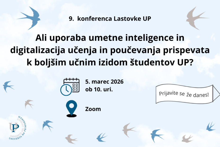 Univerza na Primorskem v sodelovanju s Centrom za odgovorno umetno inteligenco UP (CeResAI UP) organizira 9. konferenco Lastovke UP. Dogodek bo v četrtek, 5. marca 2026, potekal na daljavo prek platforme Zoom (in bo sneman). Konferenca je umeščena v okvir mednarodnega tedna odprtega izobraževanja (Open Education Week), ki ga Univerza na Primorskem redno obeležuje.