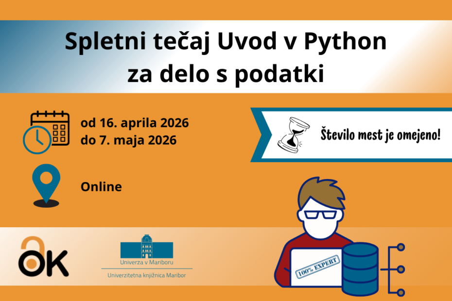 Univerzitetna knjižnica Maribor organizira spletni tečaj Uvod v Python za delo s podatki, ki se bo začel 16. aprila 2026 in bo potekal enkrat tedensko do 7. maja 2026. Tečaj bo vodil Štefan Masič, strokovnjak za relacijske podatkovne baze in uvedbo dobrih praks na področju informacijskih tehnologij. Namenjen je raziskovalcem, strokovnim sodelavcem, študentom ter zaposlenim v javnem in zasebnem sektorju, ki želijo pridobiti osnovno znanje programiranja v Pythonu. Predznanje programiranja ni potrebno.