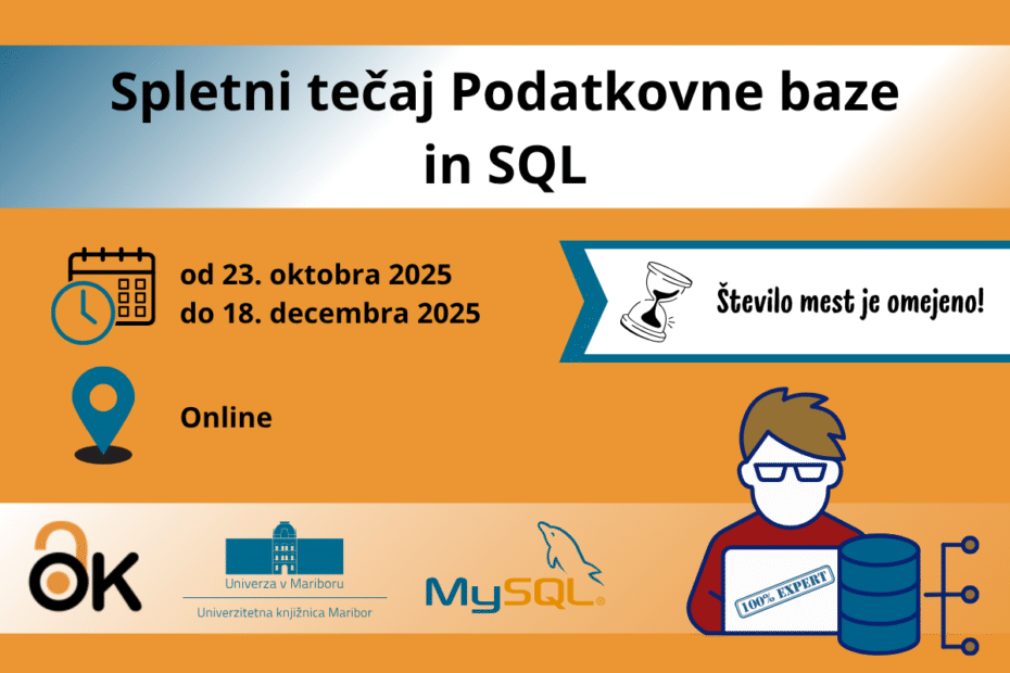 Univerzitetna knjižnica Maribor organizira spletni tečaj Podatkovne baze in SQL. Tečaj se bo začel 23. oktobra 2025 in bo potekal… Read More »Spletni tečaj Podatkovne baze in SQL