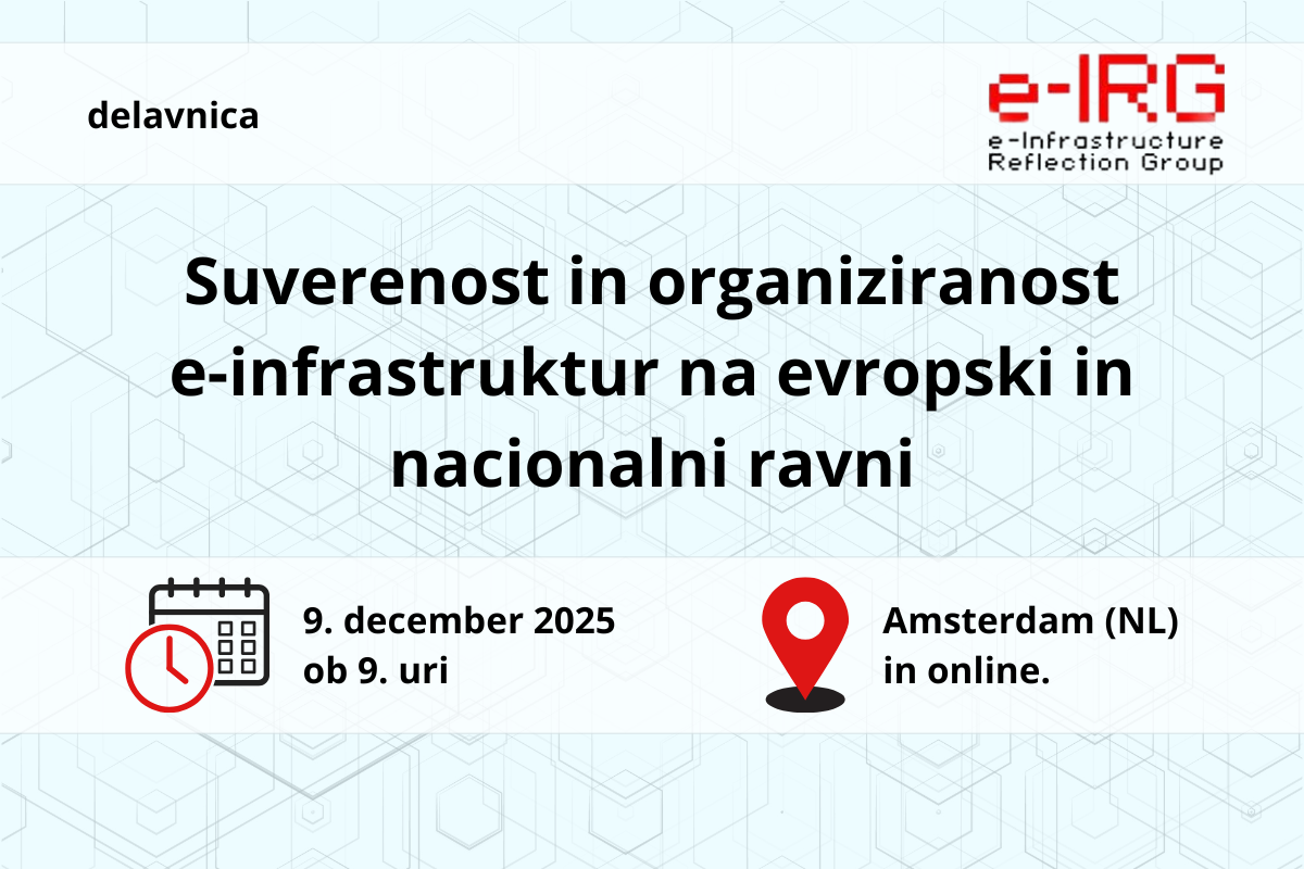Odprta delavnica e-IRG: Suverenost in organiziranost e-infrastrukturDelovna skupina tudi letos pripravlja redno odprto delavnico e-IRG, ki poteka dvakrat letno pod okriljem aktualnega predsedstva Sveta EU. Tokratni e-IRG Workshop bo v torek, 9. decembra 2025, med 9.00 in 17.00, izveden kot hibridni dogodek: gostila ga bo organizacija SURF v Amsterdamu na Nizozemskem, udeležba pa bo mogoča tudi prek spleta, kar bo omogočilo vključitev deležnikov z vsega sveta. Osrednja tema srečanja bo »Suverenost in organiziranost e-infrastruktur na evropski in nacionalni ravni«, dogodek pa bo združil predstavnike raziskovalnih, izobraževalnih, infrastrukturnih in političnih okolij, ki soustvarjajo digitalno podporo raziskavam in inovacijam v Evropi. Na delavnico se lahko prijavite .E-infrastrukture – od povezljivosti in računalniških zmogljivosti do shranjevanja ter dostopa do znanstvenih podatkov – so v zadnjih letih omogočile prebojne raziskave in sodelovanja prek meja. V času spreminjajočih se geopolitičnih razmer, večjih varnostnih zahtev in povečane potrebe po strateški avtonomiji pa se odpira vprašanje, kako zagotoviti večjo digitalno in znanstveno suverenost Evrope, ne da bi pri tem oslabila tradicija odprtosti in mednarodnega sodelovanja. Delavnica bo zato namenjena razpravi o prihodnjih usmeritvah e-infrastruktur, njihovih organizacijskih modelih ter usklajevanju na evropski in nacionalni ravni.VsebinaV prvem vsebinskem sklopu, posvečenem suverenosti e-infrastruktur, bo razprava osredotočena na to, kako evropske in nacionalne e-infrastrukture prispevajo k odpornosti in neodvisnosti evropskega raziskovalnega prostora. Udeleženci bodo obravnavali vpliv novih EU politik in regulativ, pomen povezovanja raziskav, izobraževanja in inovacij ter vlogo e-IRG pri spodbujanju rešitev, ki hkrati krepijo suverenost in ohranjajo odprto znanost.Drugi sklop bo namenjen organizacijskim pristopom in boljšemu usklajevanju e-infrastruktur. Predstavljeni bodo različni nacionalni modeli – od bolj centraliziranih »celovitih« sistemov do porazdeljenih pristopov, kjer več organizacij pokriva posamezne infrastrukturne komponente. Razprava bo segla tudi na evropsko raven, kjer bo poudarek na sodelovanju med ključnimi horizontalnimi e-infrastrukturami (npr. GÉANT, EGI, EOSC, EUDAT, EuroHPC, OpenAIRE, PRACE) ter med tematskimi raziskovalnimi in splošnimi infrastrukturnimi pobudami. Cilj sklopa je izpostaviti, kako usklajenost vpliva na interoperabilnost storitev ter na sposobnost Evrope, da učinkovito podpira vrhunske raziskave in inovacije.Delavnica e-IRG predstavlja pomembno priložnost za vse, ki so vključeni v razvoj, upravljanje ali uporabo e-infrastruktur – od oblikovalcev politik in ponudnikov storitev do raziskovalcev in podpornih služb. Dogodek bo ponudil strnjen pregled aktualnih izzivov ter odprl prostor za izmenjavo izkušenj in usmeritev, ki bodo pomagale oblikovati prihodnjo, bolj povezano in suvereno evropsko e-infrastrukturno krajino.