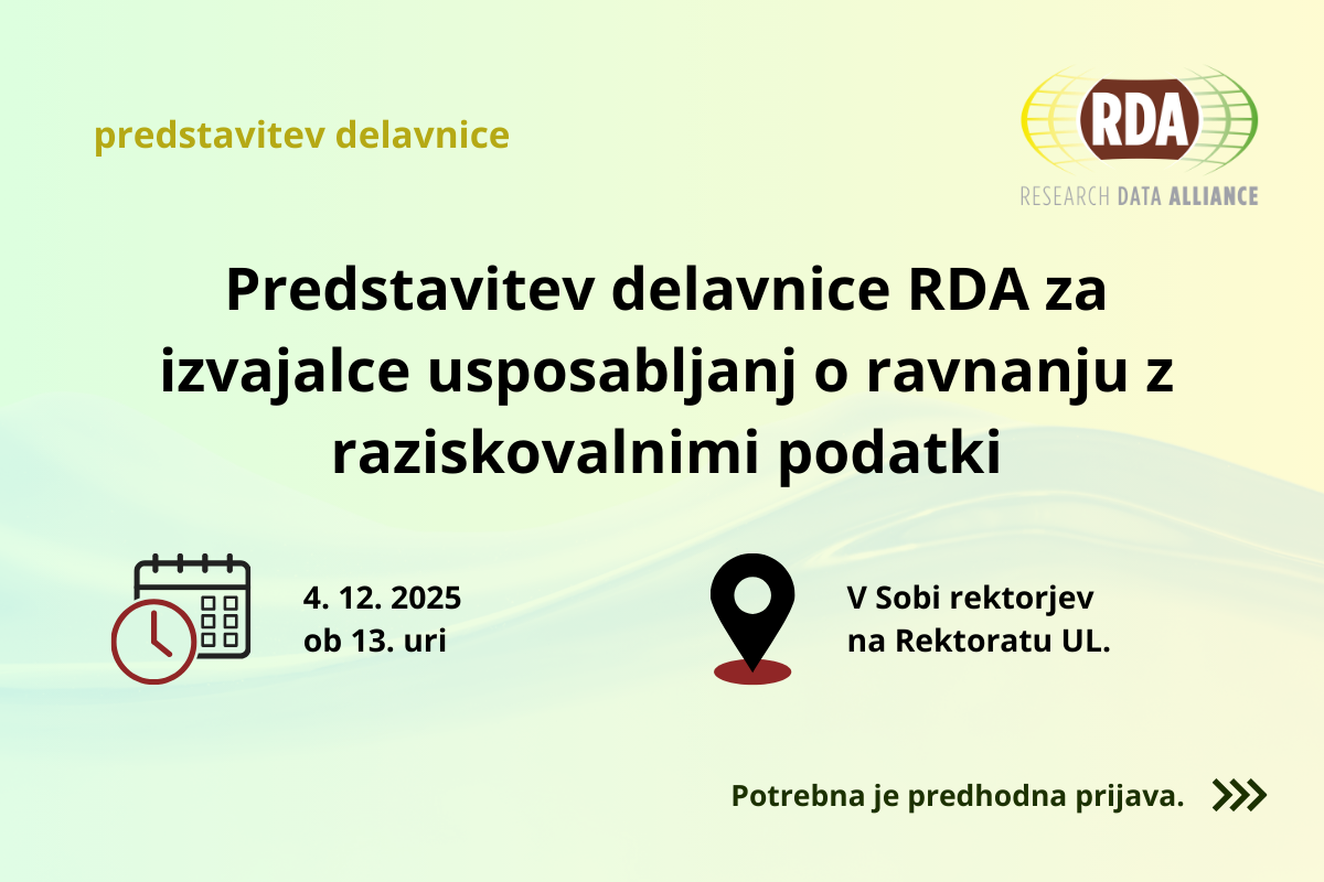 Predstavitev delavnice RDA za izvajalce usposabljanj o ravnanju z raziskovalnimi podatkiPredstavitev delavnice RDA za izvajalce usposabljanj o ravnanju z raziskovalnimi podatki bo potekala v četrtek, 4. decembra 2025, od 13.00 do 15.00 v Sobi rektorjev na Rektoratu Univerze v Ljubljani (Kongresni trg 12) ter hkrati tudi prek Zooma.Predstavitev bo izvedla dr. Ana Jenko Kovačič, podatkovna svetovalka na UL FF.Na dogodku bo predstavljena dvodnevna intenzivna delavnica Research Data Alliance z naslovom Train the Trainer Workshop on Research Data Management, ki je bila namenjena podatkovnim svetovalcem in drugim strokovnjakom, ki želijo v svojih raziskovalnih organizacijah pripravljati izobraževanja s področja odprte znanosti. Udeleženci delavnice so spoznali praktične vidike načrtovanja in izvedbe izobraževanj ter metodološke pristope za učinkovito podajanje vsebin odprte znanosti. Poseben poudarek je bil namenjen ključnim temam ravnanja z raziskovalnimi podatki, kot so življenjski krog podatkov, njihovo strukturiranje, dokumentiranje in skladiščenje, objava raziskovalnih podatkov ter možnosti njihove ponovne uporabe.Predstavitev je namenjena vsem, ki želijo v svoji matični organizaciji pripraviti krajša ali daljša izobraževanja s področja odprte znanosti, pa tudi tistim, ki bi radi izboljšali svoje komunikacijske in svetovalne veščine pri podpori raziskovalcem na področju ravnanja z raziskovalnimi podatki.Gradiva delavnice RDA (Train the Trainer Workshop on Research Data Management) so dostopna na . Prijavite se lahko .