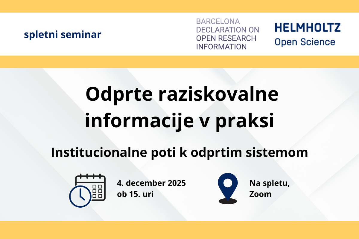 Spletni seminar Odprte raziskovalne informacije v praksiSpletni seminar Odprte raziskovalne informacije v praksi: institucionalne poti k odprtim sistemom, ki bo potekal v četrtek, 4. decembra 2025, med 15.00 in 16.30 uro, pripravljata Delovna skupina 4 in . Dogodek bo moderiral Ignasi Labastida z Univerze v Barceloni, hkrati koordinator WG4, prijava na seminar pa je odprta prek .Seminar bo predstavil štiri institucionalne primere iz Evrope in Latinske Amerike, ki že uporabljajo odprte, neproprietarne sisteme za odprto raziskovalno informacijsko podporo ali se nanje postopno preusmerjajo. Govorci bodo pojasnili, zakaj so njihove institucije podpisale Barcelonsko deklaracijo, kako poteka prehod na odprte rešitve, katere upravljavske in organizacijske odločitve so pri tem sprejemali, kakšne tehnične korake so izvedli ter s katerimi izzivi in priložnostmi so se srečali. Predstavljeni primeri bodo ponudili praktične poti in uporabne vpoglede za ustanove, ki razmišljajo o podobni preobrazbi.V osrednjem delu seminarja bodo svoje izkušnje predstavili predstavniki štirih institucij: Leibniz Association iz Nemčije (Matthias Goeritz), Univerza v Milanu iz Italije (Paola Galimberti), Universidad de Antioquia iz Kolumbije (Gabriel Vélez) ter Vrije Universiteit Amsterdam iz Nizozemske (Joeri Both in Matthijs de Zwaan). Po predstavitvah bo sledil prostor za vprašanja in odgovore ter zaključek z usmeritvami za nadaljnje aktivnosti.Dogodek je namenjen vsem, ki v institucijah sodelujejo pri raziskovalnih informacijskih orodjih in sistemih, kot so knjižničarji, strokovnjaki s področja informacijske tehnologije in raziskovalne politike, pa tudi tistim, ki pri vrednotenju raziskovalnega dela prevzemajo izvedbeno oziroma operativno vlogo. Udeležba bo posebej koristna za organizacije, ki želijo pridobiti konkretne izkušnje, nauke in primere dobre prakse pri prehodu na odprte, neproprietarne sisteme za raziskovalne informacije.Srečanje bo poudarilo, da do odprtosti ne vodi ena sama pot, temveč jo institucije uresničujejo na različne načine in v različnih fazah zrelosti. Organizatorji vabijo k udeležbi vse, ki jih zanima, kako je mogoče raziskovalne informacije v praksi narediti odprte, pregledne in dolgoročno vzdržne.